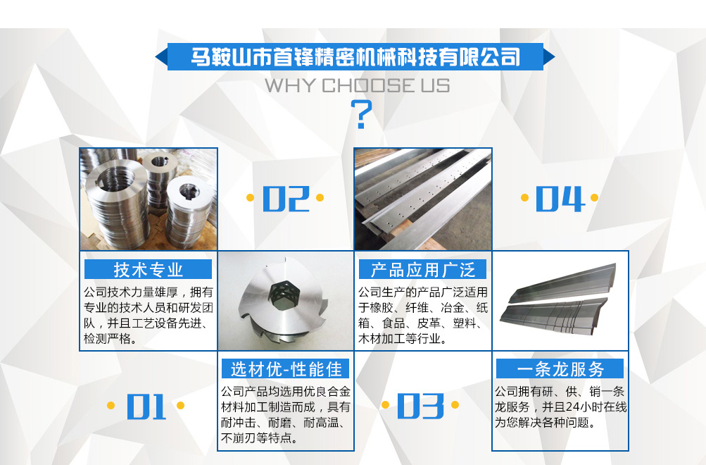 馬鞍山市首鋒精密機械科技有限公司位于中國之鄉馬鞍山市博望區博望鎮紅旗街。地理環境優越,交通便利。工業區內314省道貫穿,連接江、浙、滬、皖,距南京祿口國際機場30公里。   我們專業研發銷售各種機械圓刀、長刀、分切刀片、沖剪刀、剪板機刀片、等沖壓剪切刀具機械配件。產品廣泛應用于冶金、造紙、紙品加工、印刷、橡膠工業、塑料、木材加工、食品、金屬加工、皮革、無紡布、不干膠、膠帶、板材加工、軋鋼、紡織、五金機械等行業。   馬鞍山市首鋒精密機械科技有限公司,機械刀片加工歷史悠久,具有豐富的切削刀具加工經驗,擁有多條國內先進的研發設備和一套科學加工工藝,在保證了產品質量和品質的同時,使產品生產做到了程序化和規?;?。   我們本著“誠信、求精、高效”的精神,期待著與國內外各界開展更為廣泛的交流與合作!